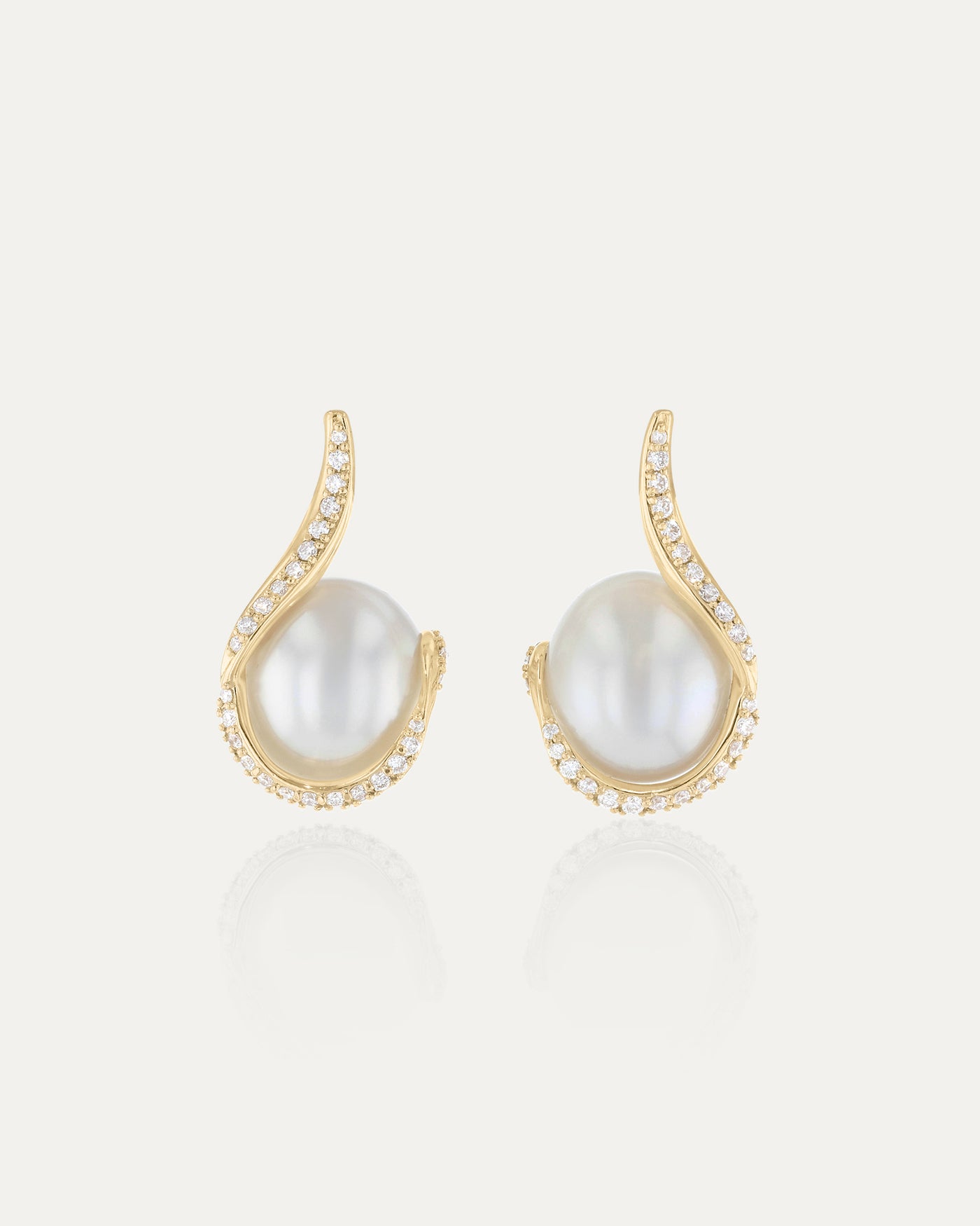 Defined by its unique flow, the Overtone Diamond Earrings showcase a South Sea pearl beautifully captured by a sweeping wrap of 18k yellow gold. Meticulously crafted as a mirrored pair, the design is richly paved with 74 round white diamonds, totalling 0.57 carats.