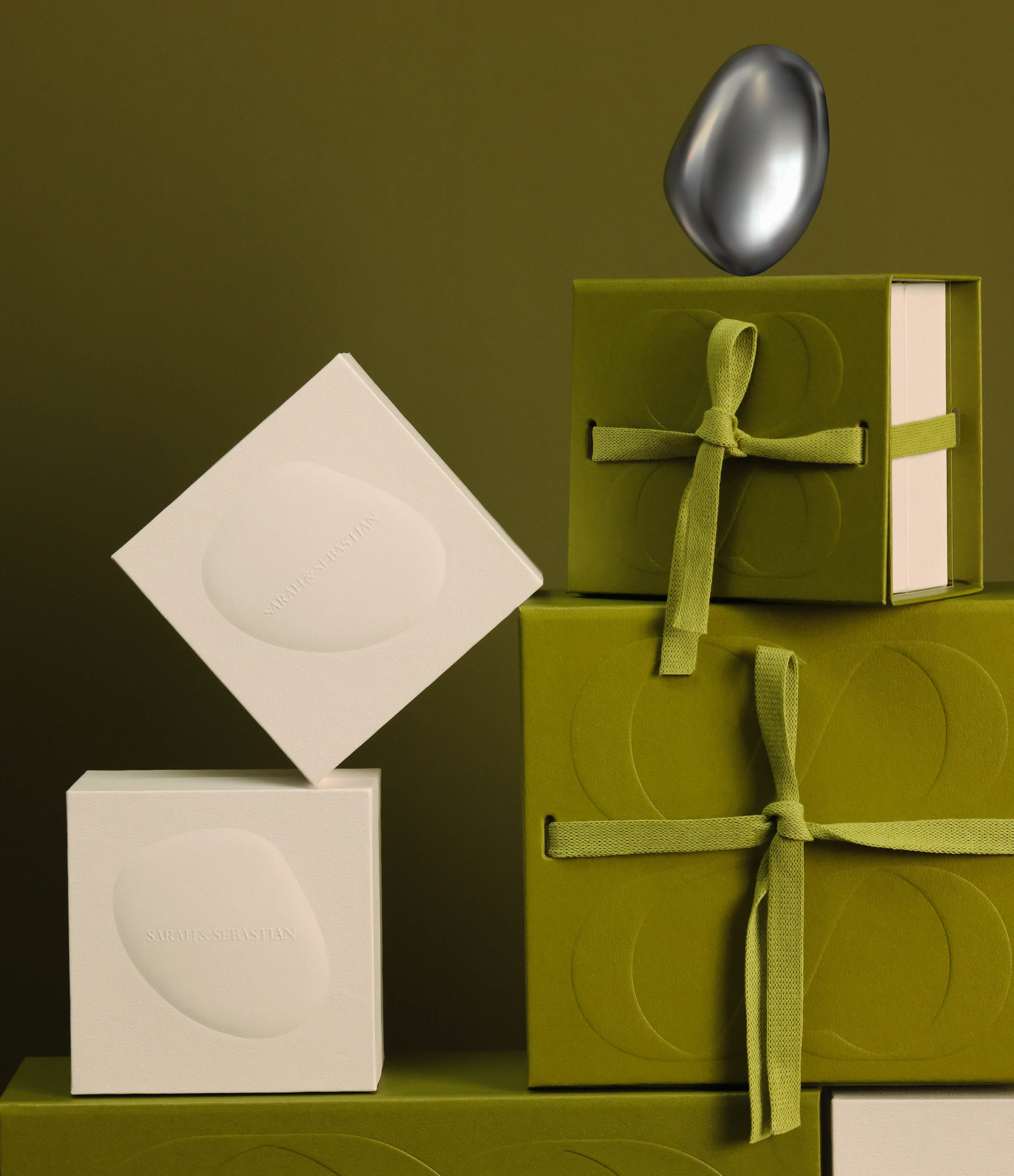 Elevating the unboxing experience, we redefined our full suite of packaging, introducing new colours, shapes and materials. Our new classic boxes are finished in fresh matte white, subtly embossed with a shell silhouette and our SARAH & SEBASTIAN wordmark. A bold colour shift, new carrier bags bring our signature Comosa green to life and bear our new symbol. Our gift wrap is saturated with the same hue of green and finished with a custom single-loop bow, adding a refreshing pop of colour to gifts for friends and loved ones.