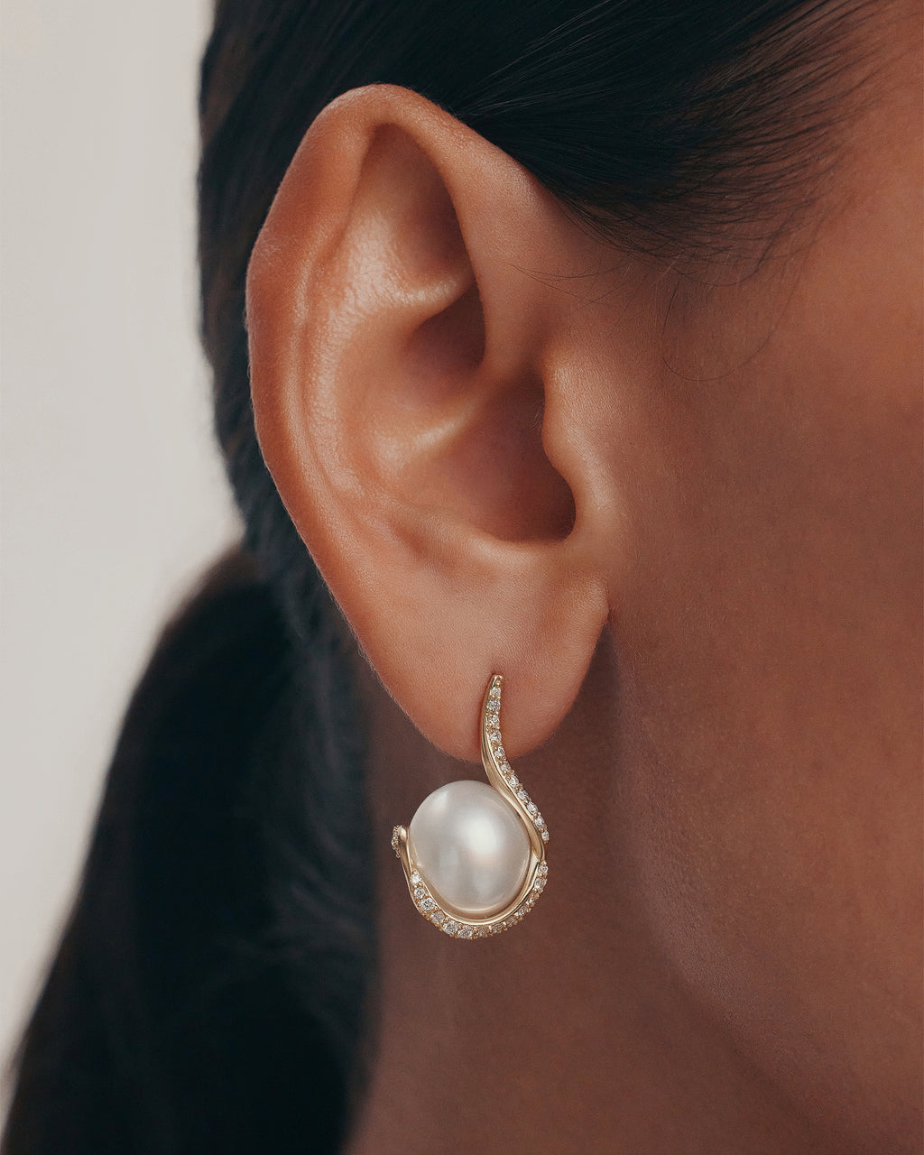Defined by its unique flow, the Overtone Diamond Earrings showcase a South Sea pearl beautifully captured by a sweeping wrap of 18k yellow gold. Meticulously crafted as a mirrored pair, the design is richly paved with 74 round white diamonds, totalling 0.57 carats.