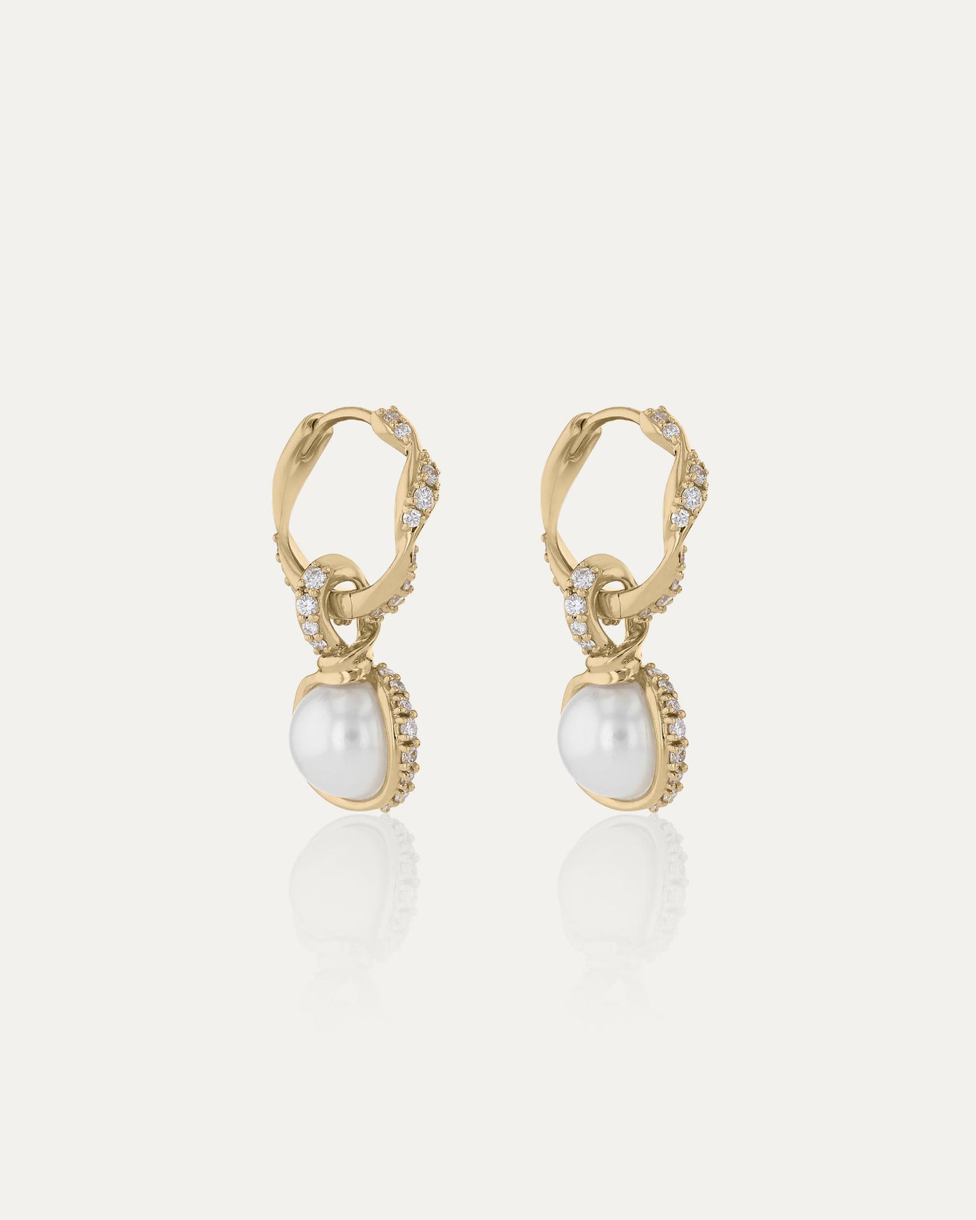 Crafted in 18 karat gold, the Overtone Diamond hoops are a mirrored pair featuring 54 round white diamonds with a total carat weight of 0.47. The 6.5mm Akoya Pearl charm is suspended within a uniquely balanced tension setting in a twisting solid gold form and can be removed with ease prior to wear.