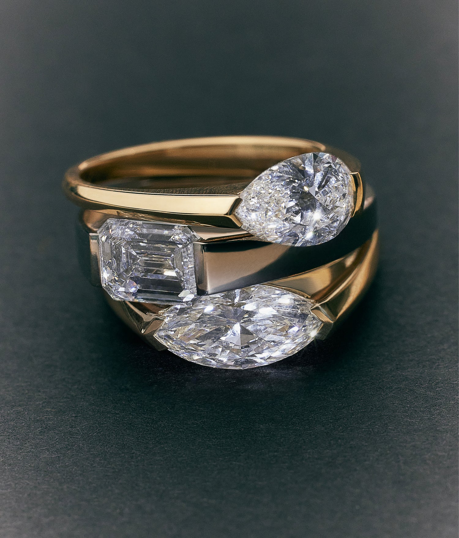 Designed side by side, SARAH & SEBASTIAN engagement rings and wedding bands are made to sit together in harmony; a reflection of two forms becoming one.